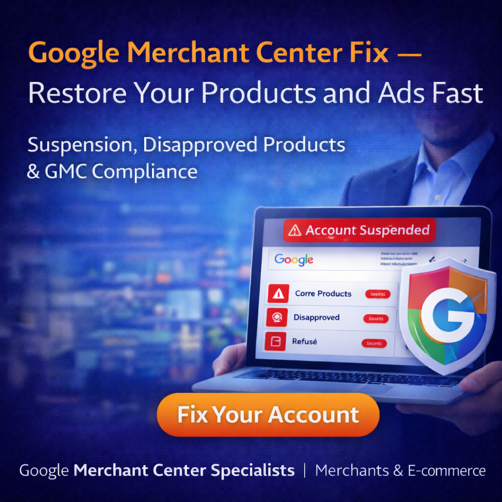 We professionally fix Google Merchant Center issues, resolve product disapprovals, and assist with suspended GMC account reinstatement so your ads can start running again.