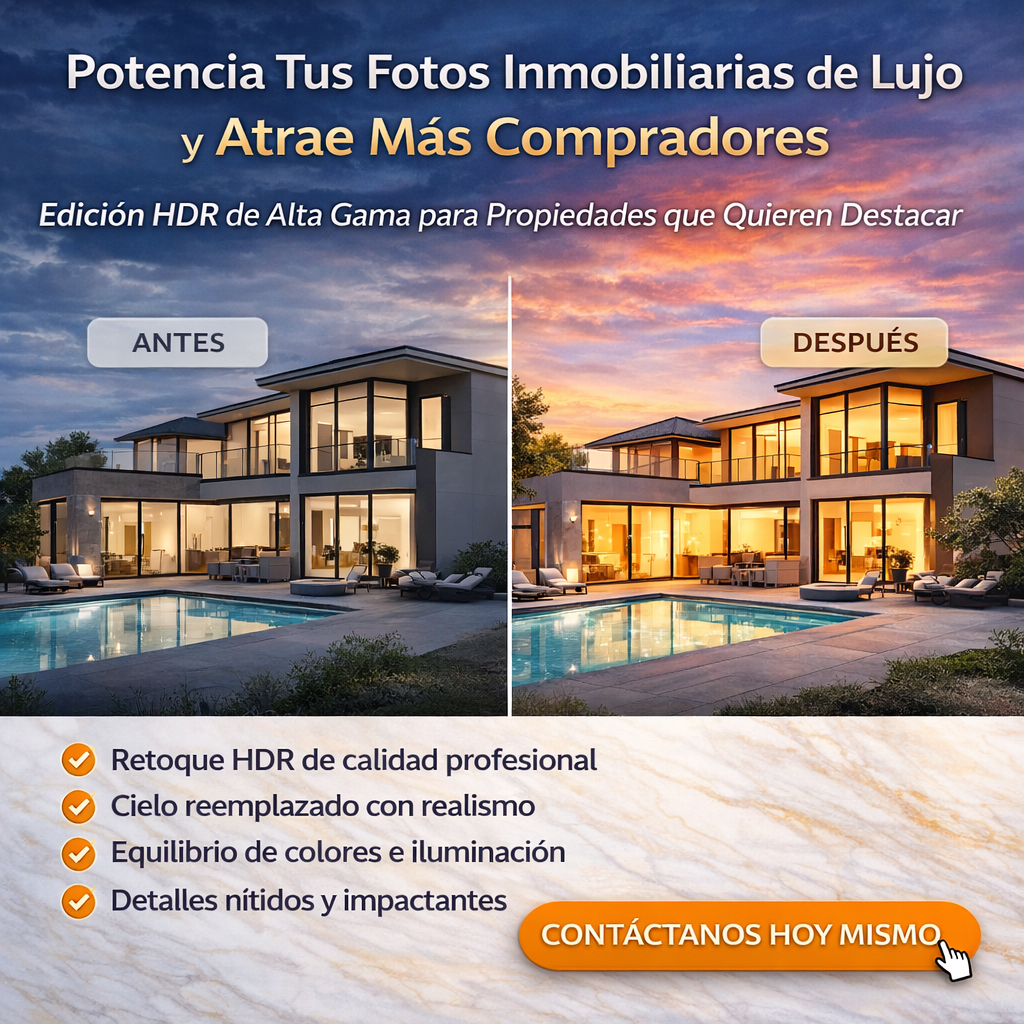 Destacamos tus propiedades con edición HDR profesional de alta gama, diseñada específicamente para el sector inmobiliario.