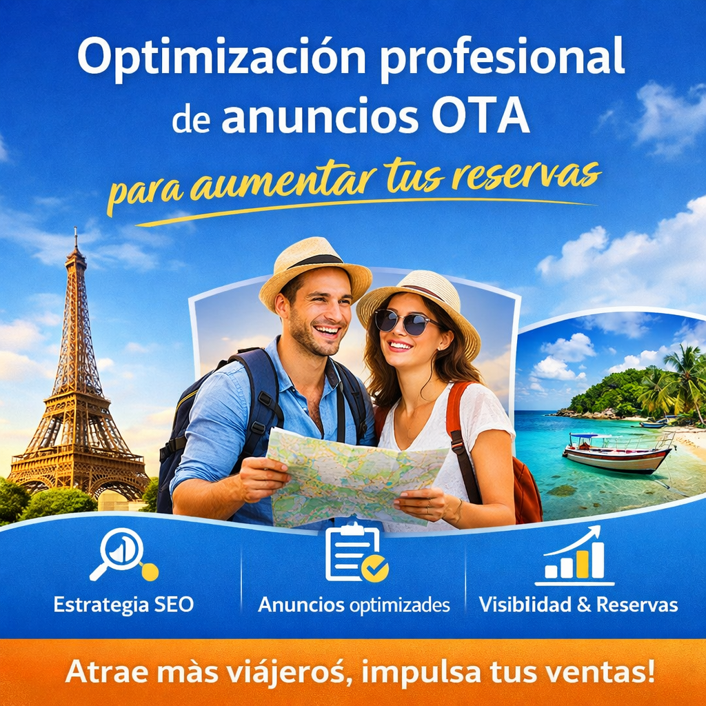 Nos encargamos de la configuración y optimización profesional de tus fichas de actividades o propiedades para cumplir con los estándares de las OTA y maximizar la visibilidad y las conversiones. Nuestro servicio incluye: